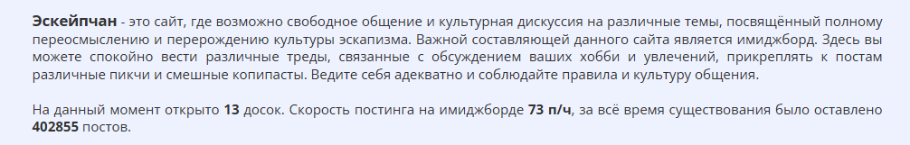 >>1162098 27.10.2025 На данный момент открыто 13 досок. Скорость постинга на имиджборде 52 п/ч, за всё время существования было оставлено 400591 постов.