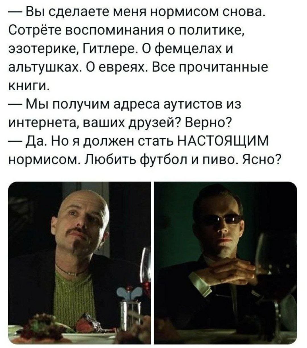 >>1265009 Анончик, я собирался развернуто ответить, но дочитал до тухлого тейка "повзрослей", уровня "не служил не мужик", так что особо усилий тратить не буду. Налаживание новых связей с быдло нормисами - не нужно, это только отнимает время и не дает ничего. Налаживать связи надо с крутейшими челами, единичными. Взаимодействие в обществе переоценено. Сейчас вполне можно ограничиться заказом через доставку. Механизм взаимодействия нормисов до смешного прост. Когда собирается несколько нормисов, они вынуждены выбрать для общения минимально общую доступную тему. И не могут выбирать всякие сложны или запрещенные для обсуждения в обществе темы. А дальше, чудес не бывает. Поскольку ресурсы времени и внимания ограничены, то они и прокачиваются только в нормисообщении, а в других темах не прокачиваются. "Повзрослей" в смысле "обыдлей" - это как раз и подразумевает отказываться от потенциала в разных сферах, в пользу некого усредненного нпс, который как раз ничего не делает. Опять же, тут ничего удивительного, люди стареют, теряют пластичность мозга, теряют ловкость тела, соотетственно начинают предпринимать все меньше действий, и если смотреть на то, что большинство ничего не делает, то и начинает закладываться мысль, что раз большинство, то это норма, а значит надо вести себя так же. (хинт - нет, не надо.)