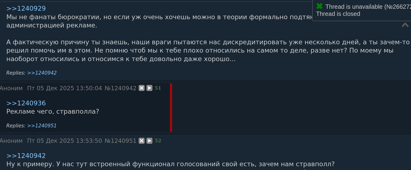 >>1380955 Голосование, же, не только тут. Кроме того, что обязательно будут те, кто его признают подкрученным/нелегитимным. Лучше уже аутсорсить ответственность, тем более что на стравполл внедрили некоторую защиту от абьюза голосований.