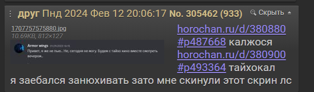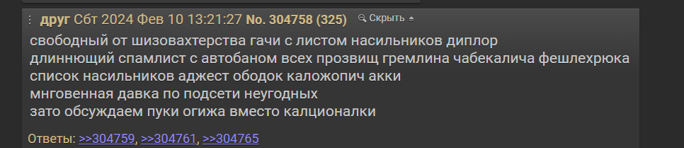 Каловода - самофорс + самоподсос - форс своих конф с вайпами тредов - залет в конфу с попыткой подсосаться к местным и их пахану зигфриду - обосрался в тоф треде предав всех анонов - неспособен ответить за свои слова кроме слива на ровном месте с семенством от другого лица