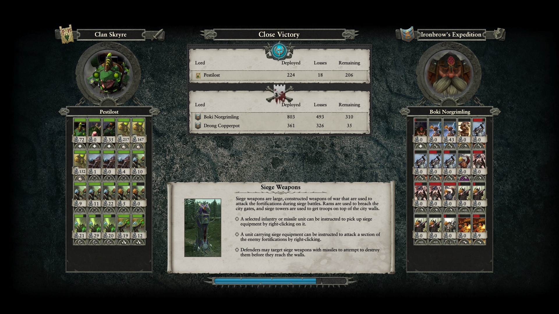 Ну это и не секрет конечно. Клан Скрайр уступает наверное всё же Дарк и Хай эльфам, но ядерки, бесконечный боезапас у ратлингов, в целом апгрейды в мастерской, ето йоба. Алсо я никогда не юзал мортиры отравленного ветра, а они оказались очень круты. Легендарная мортира вообще имбища какая-то.