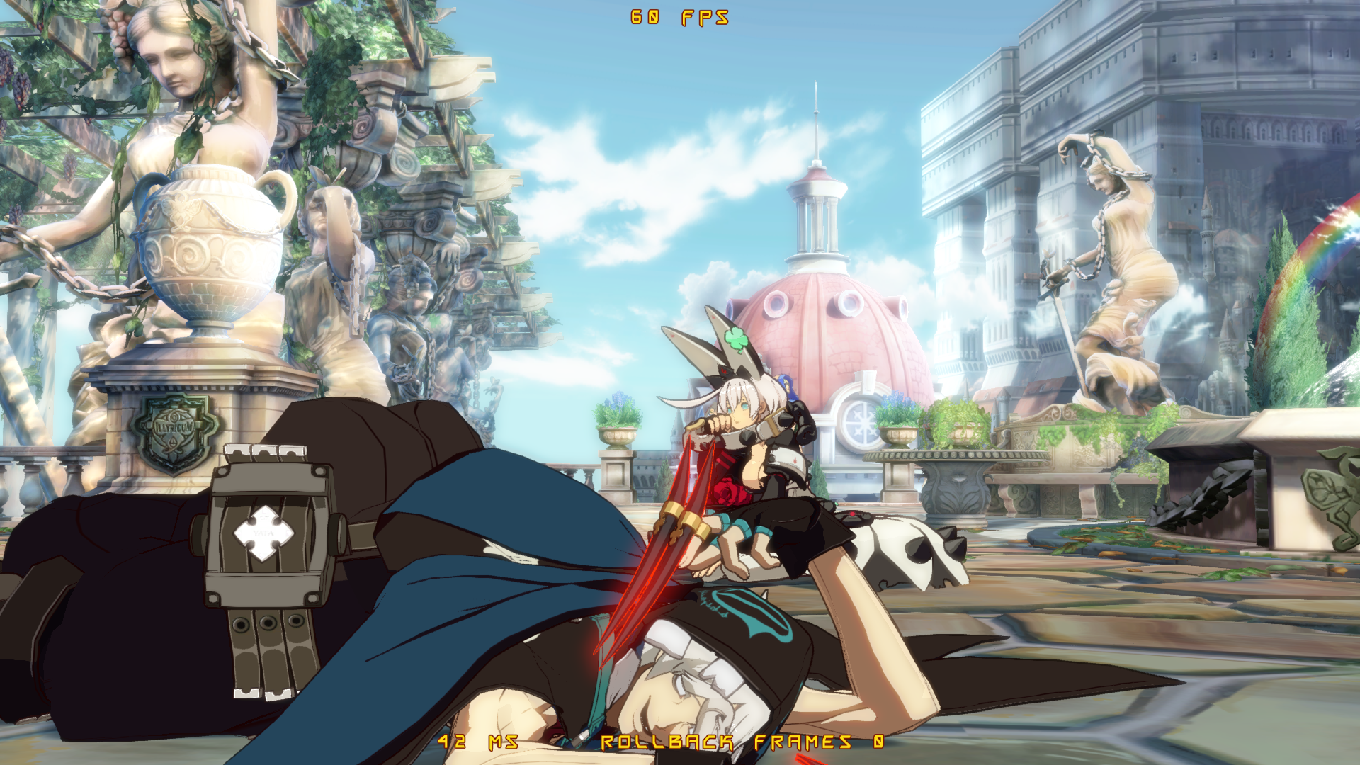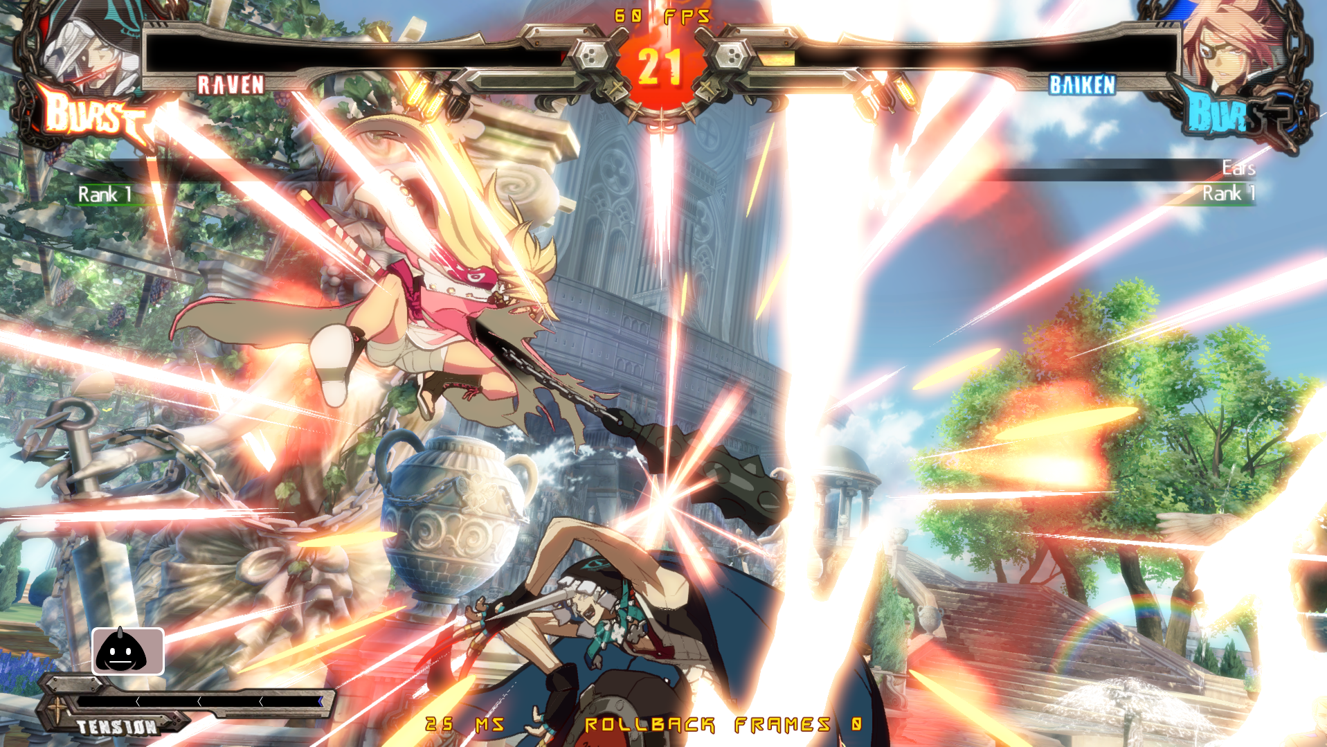 У Чмороны вместо эйрдэша как бы планирование вниз. Он быстро снижается и летит близко к земле, при этом имея возможность атаковать и скорее всего эти атаки коннектятся в наземные потом. У этого явно есть и минус - из корнера не выпрыгнешь. Ещё у него длиннющие нормалы и довольно быстрые проджектайлы-иголки, плюс есть медленный антиэйр орб. Ещё у него есть специвальный ресурс, который по чуть-чуть капает с некоторых ударов (непонятно как его им набирать) и генерится быстрее когда входишь в специальную стойку, в которой просто стоишь. Если тебя в неё бьют, то ресурс генерится ещё быстрее плюс ты имеешь шанс отрегенить полученный в стойку урон то ли нанося дамаг быстро после этого, то ли просто его не получая. Я точно не уверен. Чего ресурс делает я не уверен, помимо того, что он увеличивает явно урон и анимации ревёрсал ДД. Ну и в целом Чморона такой фриковатый около-мазохистский персонаж похоже.