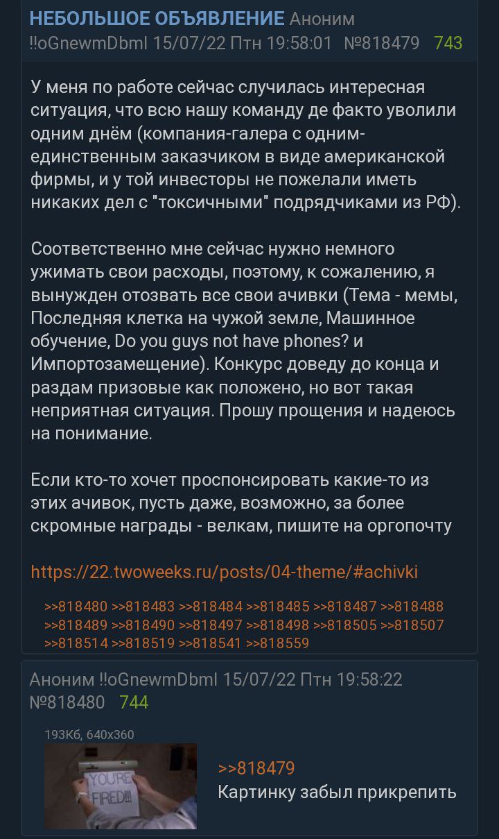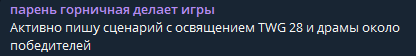 А так ну извини что так вышло. Вначале мы не хотели пилить ТВГ, а думали пилить свой конкурс, это правда. Но тред удалили и нам пришлось так поступить, и я считаю что в итоге от такой коллаборации будет польза, а не вред.
