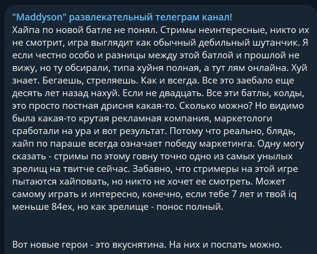 Не понимаю абсолютно почему на новом Батлфилде такой ажиотаж по просмотрам, это же хуйня на постном масле, вчера как раз разговаривали с ребятами на тему того что сейчас буквально не во что играть, а уж тем более нечего стримить и все сидят хавают афк контет. Забавно то, что даже если и выходит чето годное зритель скорее с кайфом посмотрит как стример смотрит другого стримера, который смотрит как мыло режут 40 часов. Я заметила что и люди , взять мою аудиторию, ужасно ноют о любой сессионке, процентов 80 адски начинают ныть когда я подрубаю доту, но при этом что удивляет, смотрят её больше раза в два, а то и в три чем какую нибудь интересную игру с сюжетом. А тут стрелялка, не выдающаяся абсолютно ничем, даже если сравнивать с другими ее частями. Не понимаю я нынешнее поколение аудитории..