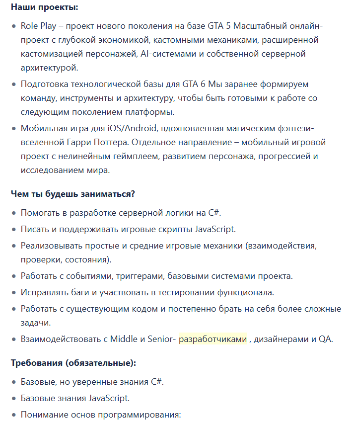 зачем вы обсуждаете зарплату джуна у какого-то гта 5 онлайн сервера? вы ебанутые? эта вакансия чисто опыт получить как реальный так и в трудовую и катиться куда-то дальше