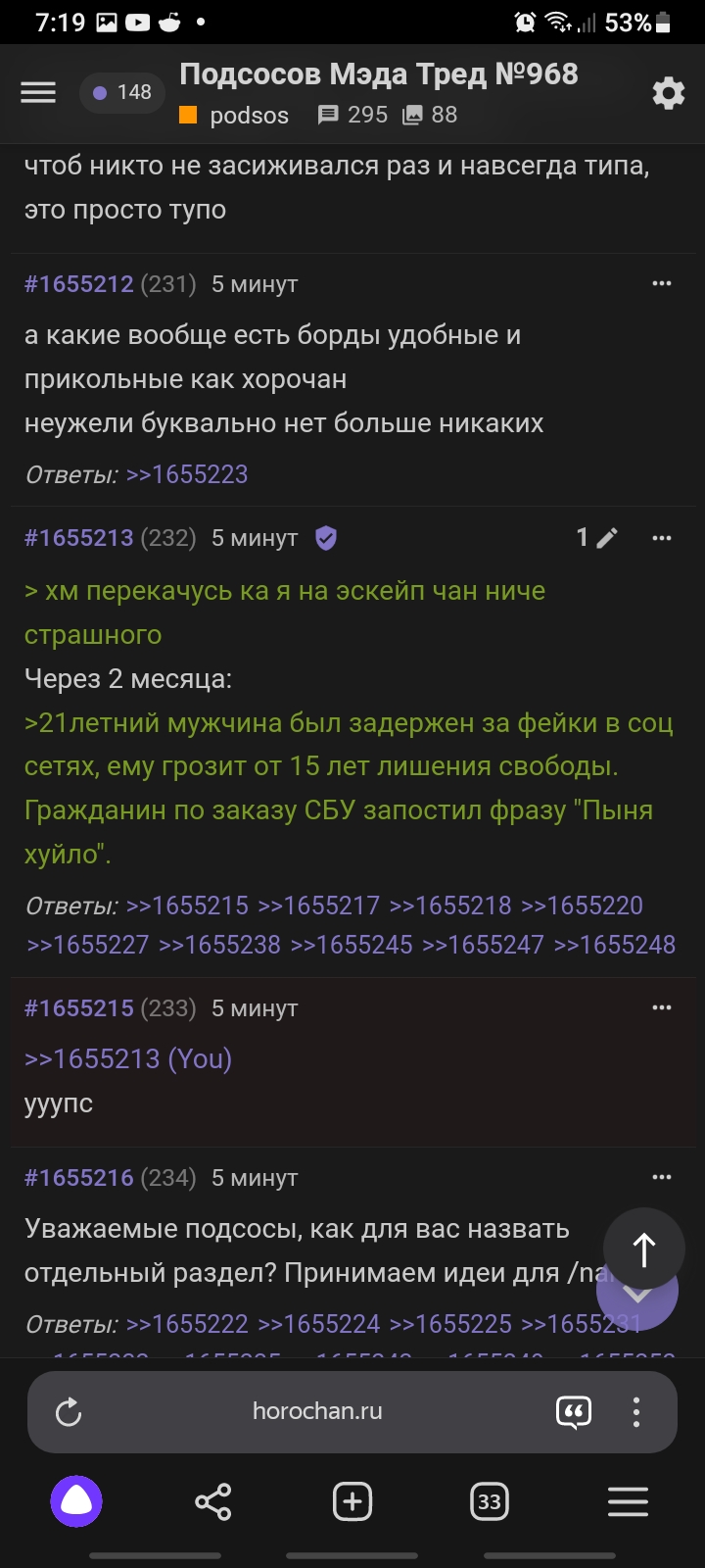 Заметьте нам нигде не дают добить юбилей. В фаге нам дважды резали глотки бесконечным терпением, не давая год добить 10к В соце не дали косарь добить В хорочане 20 тредов до косаря не добили Это заговор, не иначе