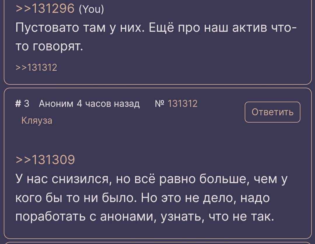 Удручает конечно ситуация с дудосингом борды. Но все в конечном счете будет норм. Замечательный проект. И еще этот раскол в чятике, придется на один тред больше в избранном держать. Щито поделать, десу, но я понимаю Принцессу йоу. А вы как, анончики? Подрячком? Не считая невыносимой погоды, конечно, от которой не эскапироваться и в четырех стенах.