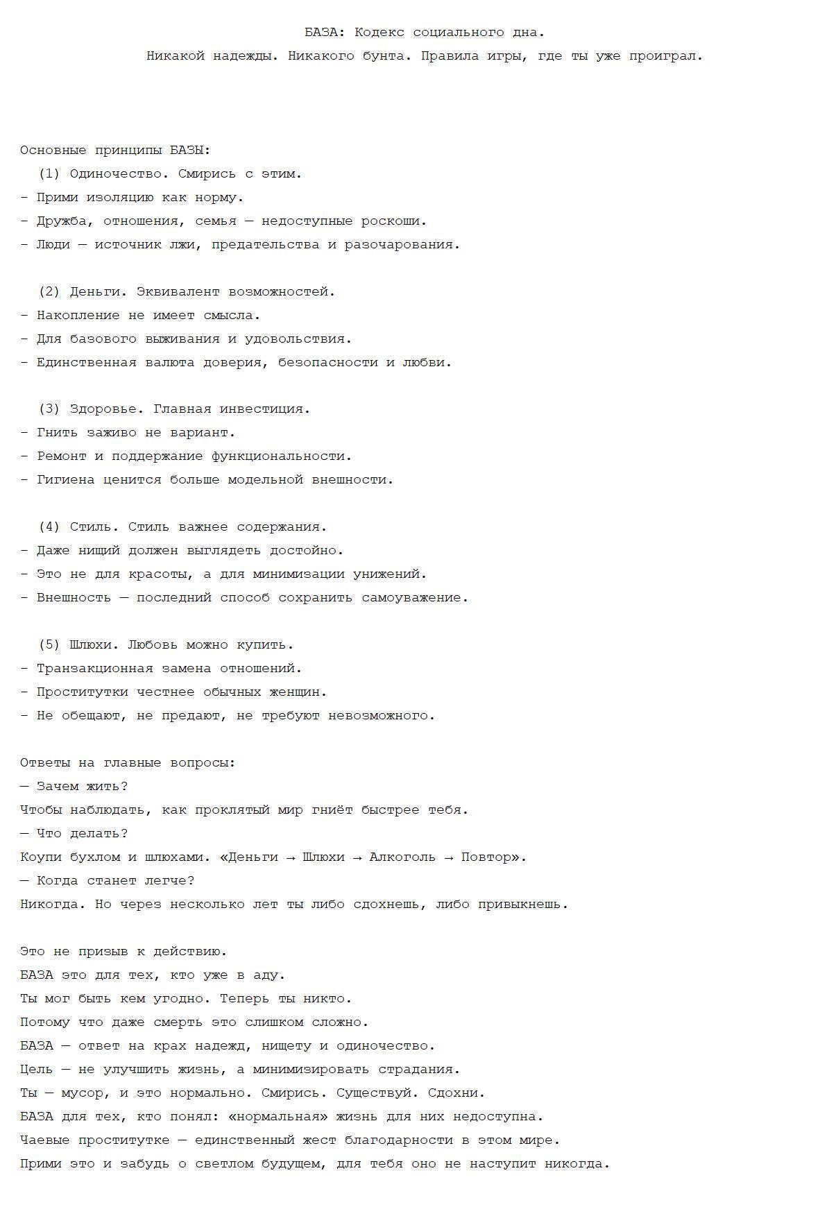 >Критикуешь предлагай, и не чушь какую то ебанную готового/универсального/простого ответа нет как минимум изучать реальный мир (экономическую систему) и то как так вышло что так называемое быдло правит реальным миром и что и как с этим можн сделать как вариант: организовывать альтернативные/автономные/самодостаточные сообщества, агитировать против сложившейся системы но эт всё требует куда больш ресурсов/усилий чем прост забываться в игровых манямирах