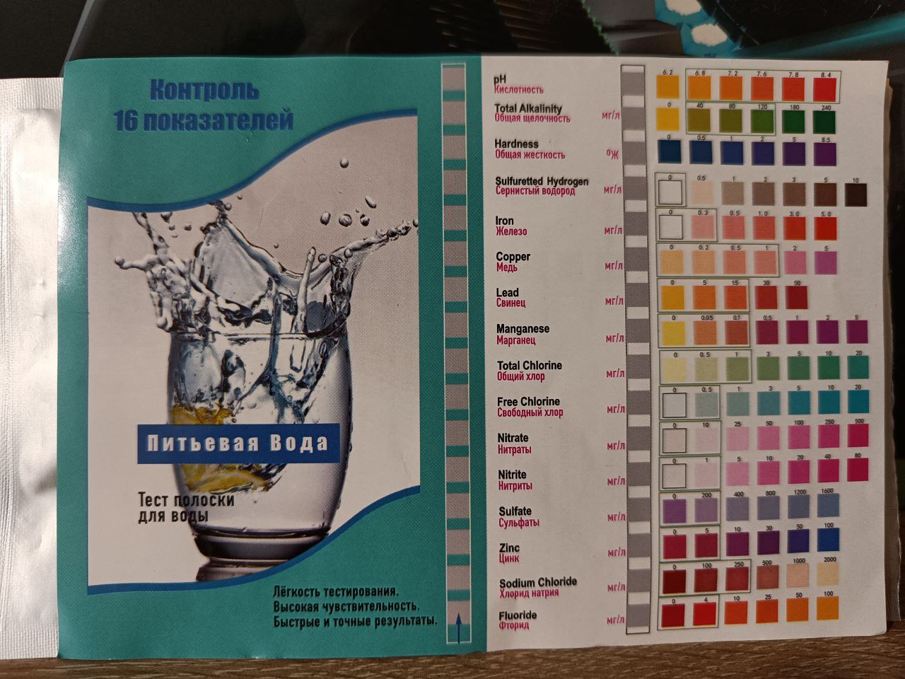 Суть в том, чтобы опустить тестовую полоску в воду, на полоске меняются цвета, затем за две минуты надо успеть записать показания, сравнив цвета. Разцница есть в воде из разных источниках, в воде из скважины половина превышает референсные значения. В городской лаборатории полный анализ воды стоит больше 70к