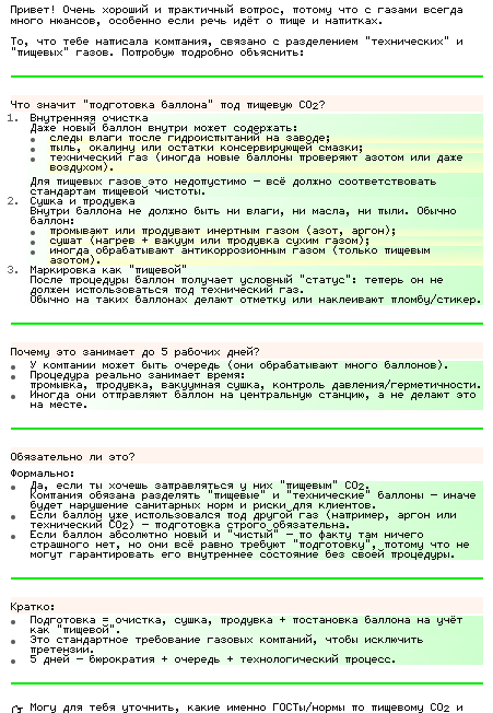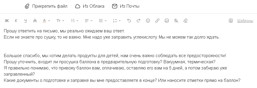 Поблагодарил за заботу обо мне, сказал что мы будем делать напитки для детей и нам очень важна безопасность. Подушнил насчет просушки баллона, будет ли она вакуумная или термическая, какие документы нам дадут и как вообще все это будет. Писали в 2 живых рыла и 2 искусственных. Так как я серьезный кабанчик, отправить в 2 часа ночи письмо я не мог, а в 7 утра я проспал, вот жду ответа, думаю ответят ЗАВТРА.