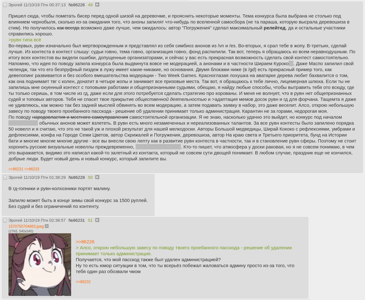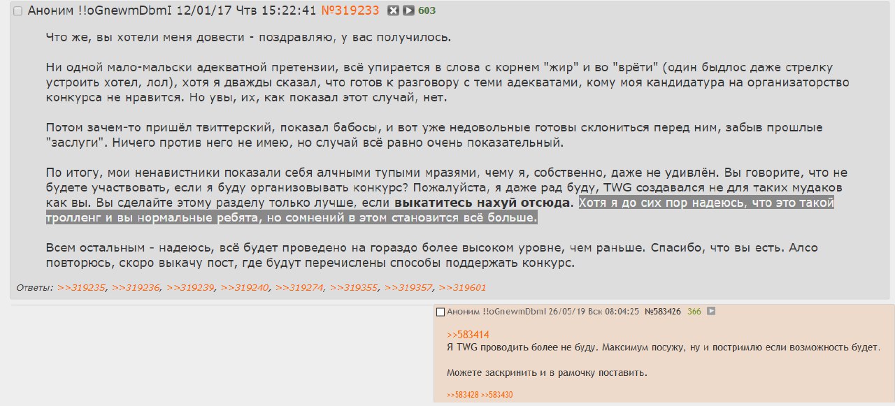 А так ну извини что так вышло. Вначале мы не хотели пилить ТВГ, а думали пилить свой конкурс, это правда. Но тред удалили и нам пришлось так поступить, и я считаю что в итоге от такой коллаборации будет польза, а не вред.