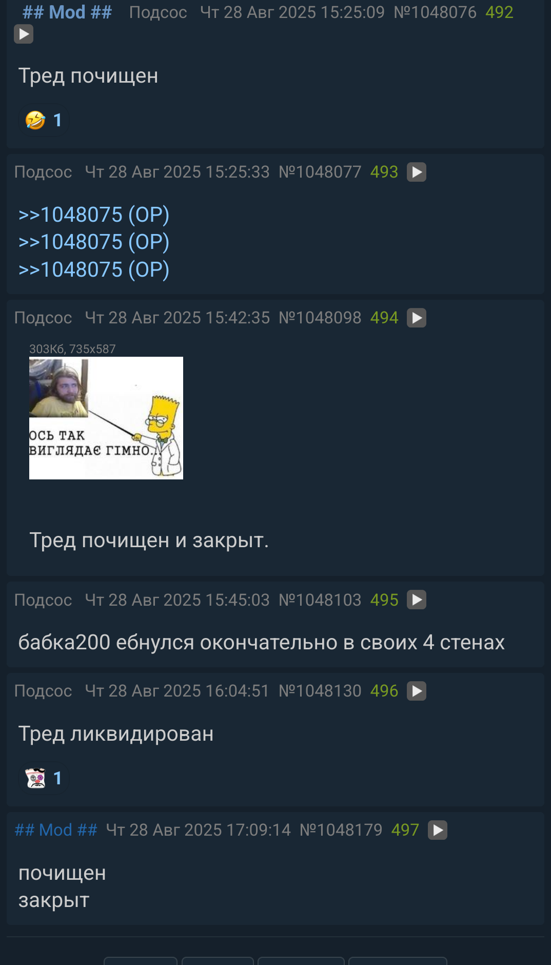 >>1048206 Это нужно, чтобы облегчить задачу других модеров. Он чекает конец треда, видит, что кто-то уже почистил и ему не надо всё это дерьмо заново перелопачивать, другой доброволец нашёлся. Чистить и закрывать надо обязательно, потому что кто-то постоянно в РКН доносит, при том предупреждения могут прийти за малейшую хуйню.