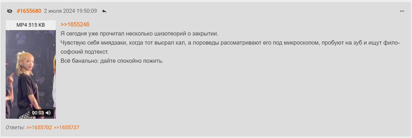обсуждение никогда не вертелось только вокруг ильи, данный раздел сведётся к скриптовому повторению "мэд база" и затухнет