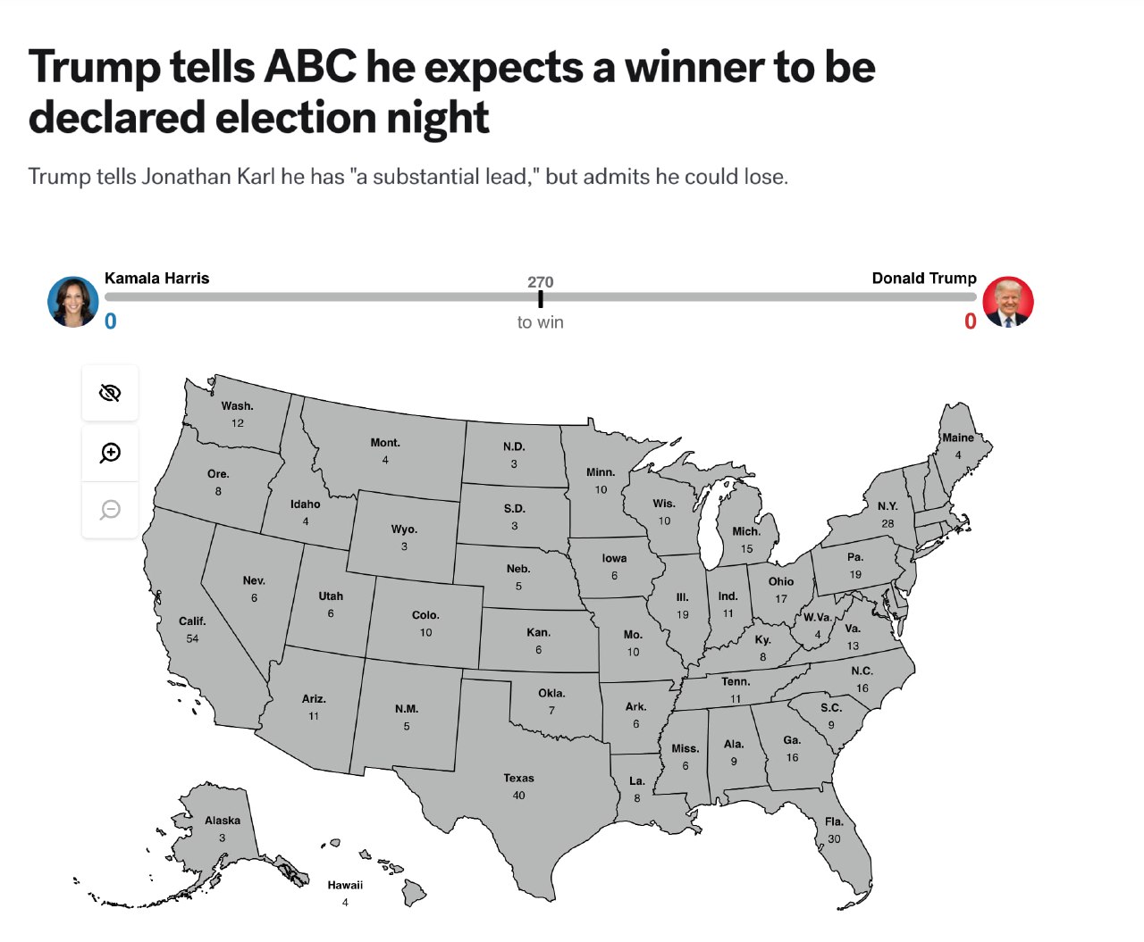Первые участки закроются в 19:00 ET (03:00 среды МСК) в Джорджии, Индиане, Кентукки, Южной Каролине, Вермонте и Вирджинии, а последние — в 00:00 ET (08:00 среды МСК) на Гавайях и в Аляске.