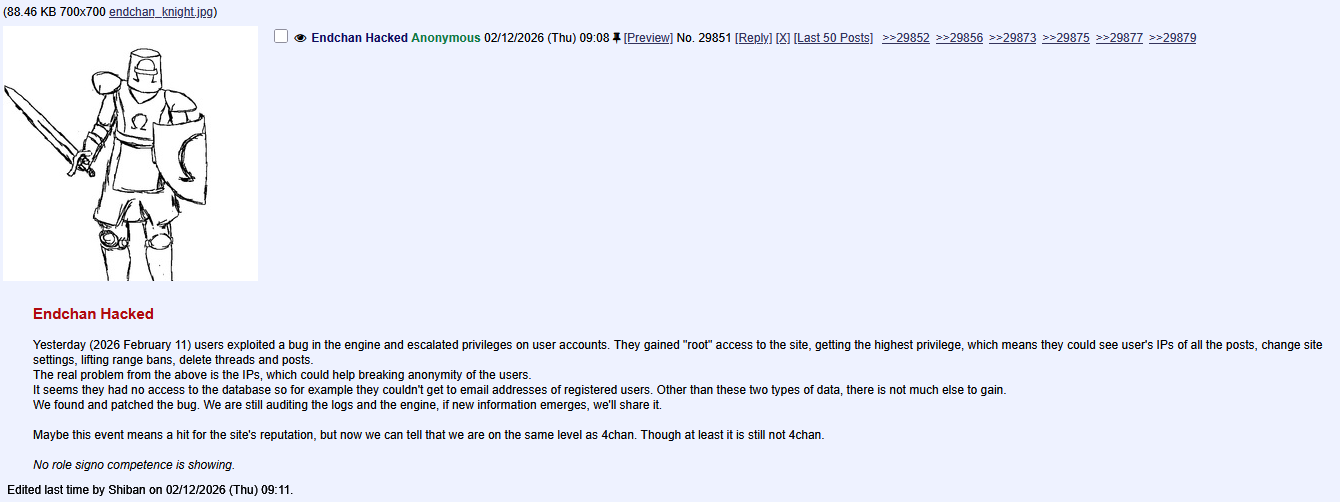 1. Эндчан был взломан. Не вдаваясь в детали, взломщик мог несколько часов пользоваться суперадминским режимом и видеть все IP всех постов на всех бордах. 2. Примерно в этот же момент главный админ удалил треды с деаноном сотрудников РКНа, с его слов - по запросу хостинг-провайдера.