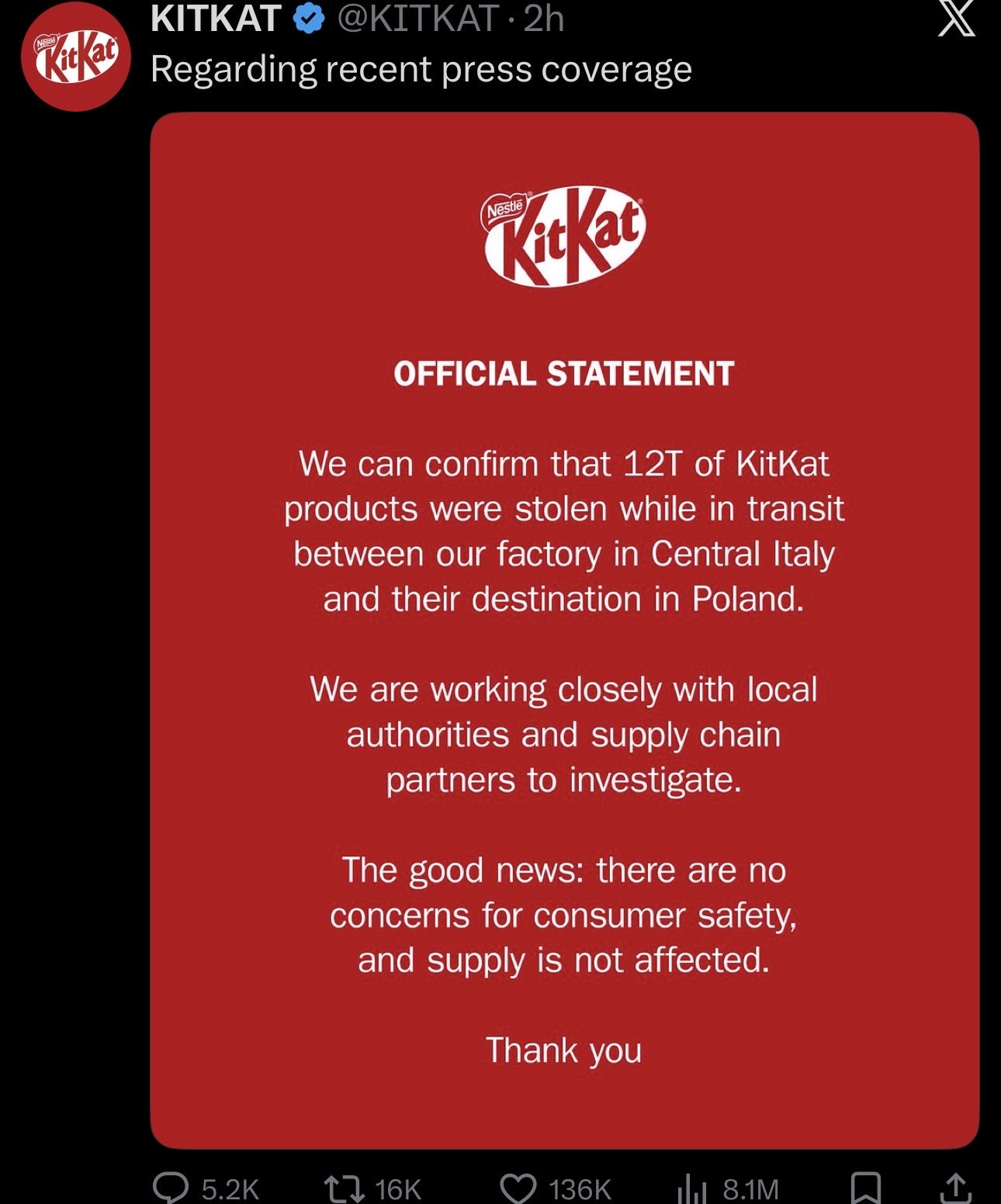 Компания Kit Kat подтвердила недавнее ограбление склада, в ходе которого было похищено 12 тонн продукции. «Мы тесно сотрудничаем с местными властями и партнерами по цепочке поставок. Хорошая новость: безопасность потребителей не вызывает опасений, и поставки не пострадали».